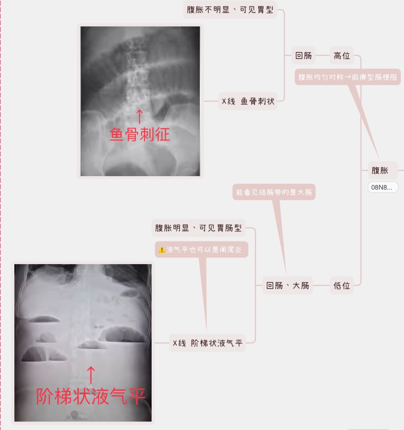 高位梗阻:空肠梗阻,鱼肋征(鲤鱼旗在高空中)。呕吐早次数多、为胃内容物,腹胀腹痛不明显、粘膜环形皱襞(鱼刺骨状)。空场粘膜皱壁更丰富,肠管扩张的时候,两空肠肠壁叠加,形成高密度影的“鱼骨”,两边的粘膜皱壁是高密度影,构成了“鱼刺”