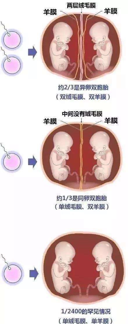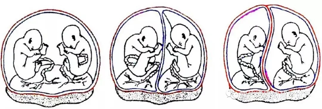 单绒毛膜+双羊膜:合租,同一个房子里,每人一个房间。