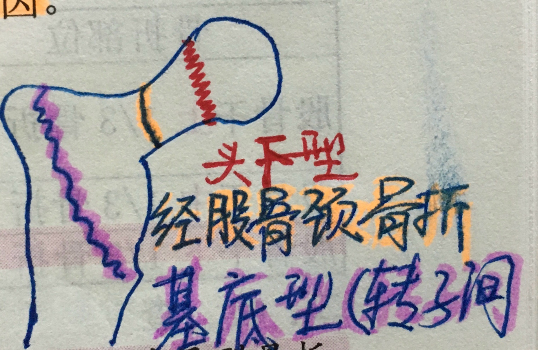 基底型--不容易发生。股骨颈基底骨折(BC错)的骨折线位于股骨颈与大、小转子间连线处,尚有旋骨内外侧动脉分支吻合的动脉环提供血液循环,故对骨折部血液供应的干扰较小,不易发生缺血性骨坏死。